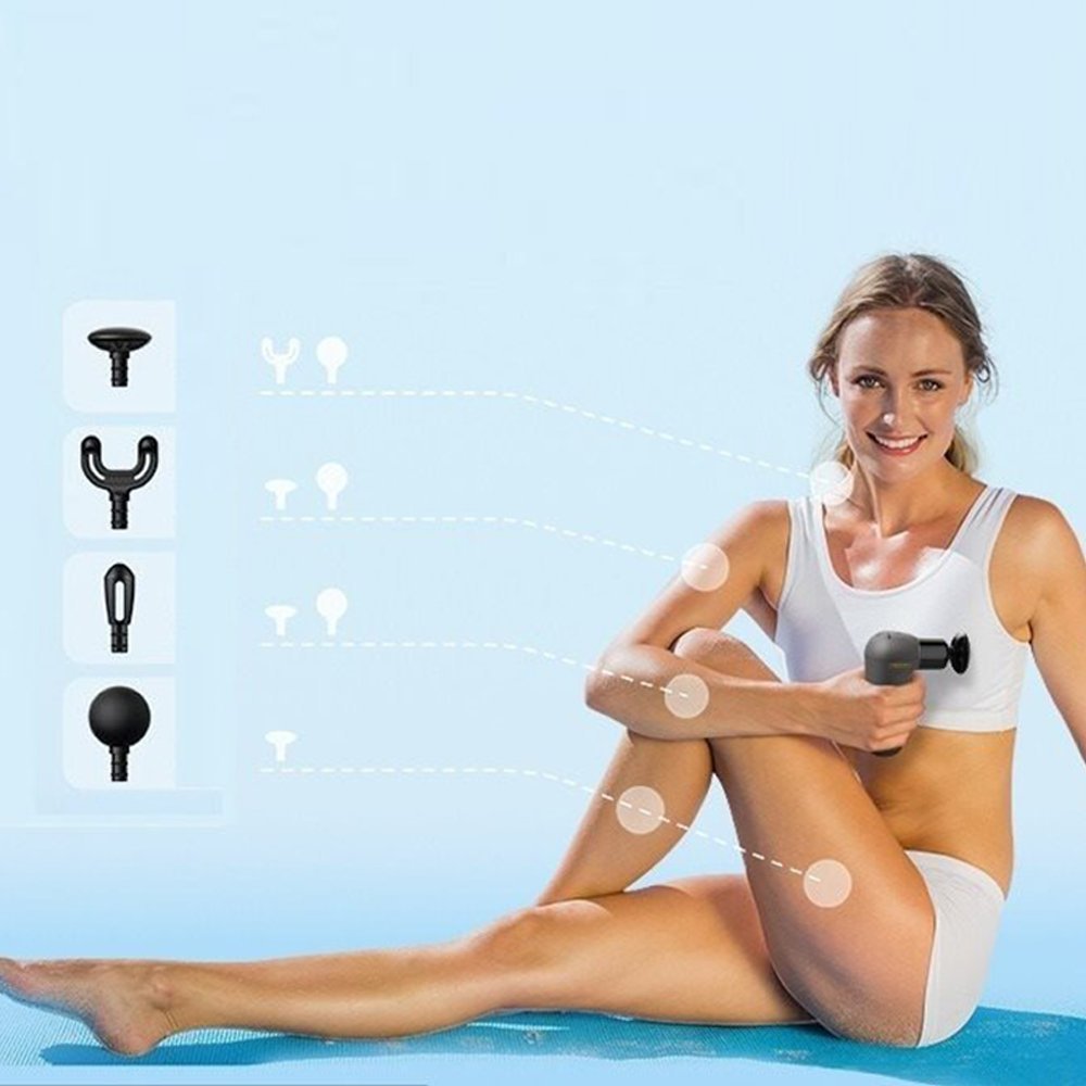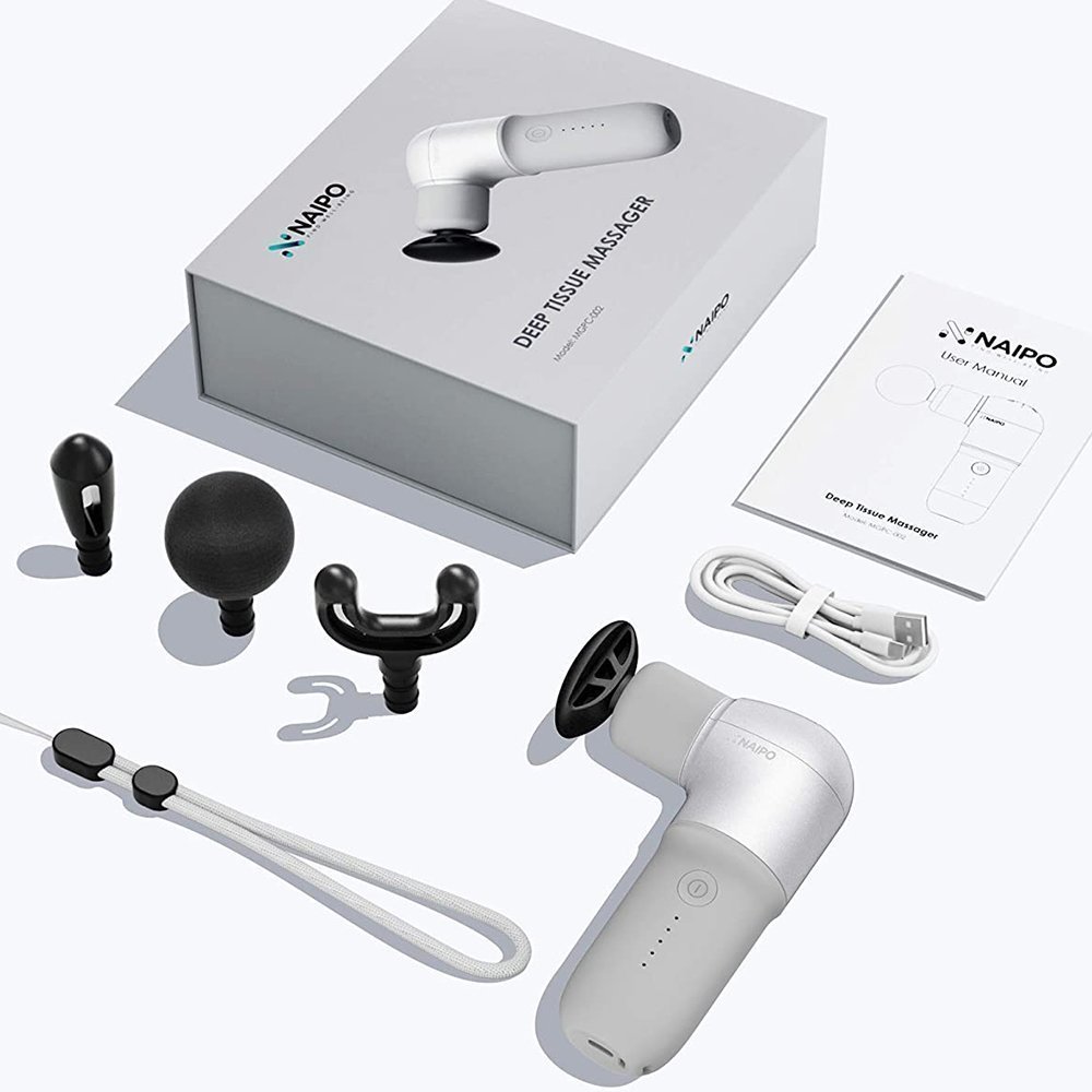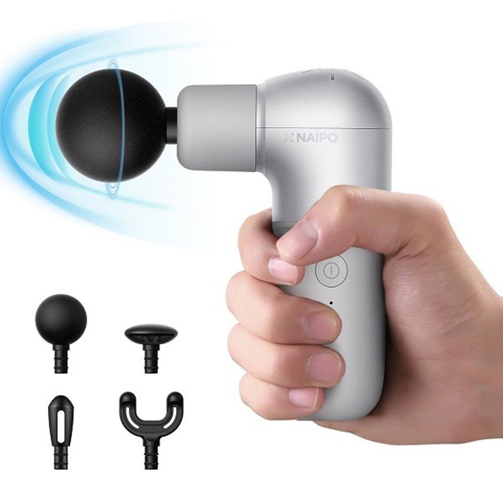 SUPER LIGHT AND PORTABLE, 5 SPEEDS, 4 INTERCHANGEABLE HEADS ERGONOMIC HANDLE - The NAIPO Mini Massage Gun comes in an inverted L shape with a no-slip handle that tapers slightly at the bottom. Designed to make it comfortable and easy for one-handed operation. LIGHT & PORTABLE – The NAIPO Mini Massage Gun weighs only0.4 kg (0.88 lb), similar to a mobile phone. With a wrist lanyard attached, you can carry it in your pocket or handbag, use it at home, in the office, outdoors, or even on the road. Relieve tight muscles and soreness anytime and anywhere. COMPACT, BUT POWERFUL - Although small in size, this massage gun is just as powerful as a much larger model; delivering up to 3000 rpm, or percussions per minute, to give a deep tissue massage. With a built-in brushless motor and sound isolation technology, it produces <45 dB in noise, significantly quieter than human conversation. 4 MASSAGE HEADS & 5 INTENSITIES - Four massage heads provide different treatment options for targeting different muscle groups. Five intensities, from low to high, help activate muscles before exercise, relax muscles after workouts, eliminate soreness and stiffness after sedentary work, and accelerate the rejuvenation of your body. CONVENIENT USB-C CHARGING - This massage gun comes with a USB-C cable, making it easy to recharge anytime and anywhere. The rechargeable lithium-ion battery with 2000mAh capacity can last for about 2 weeks after fully charged. A GREAT GIFT - This is great for personal use or as a thoughtful gift for family and friends!